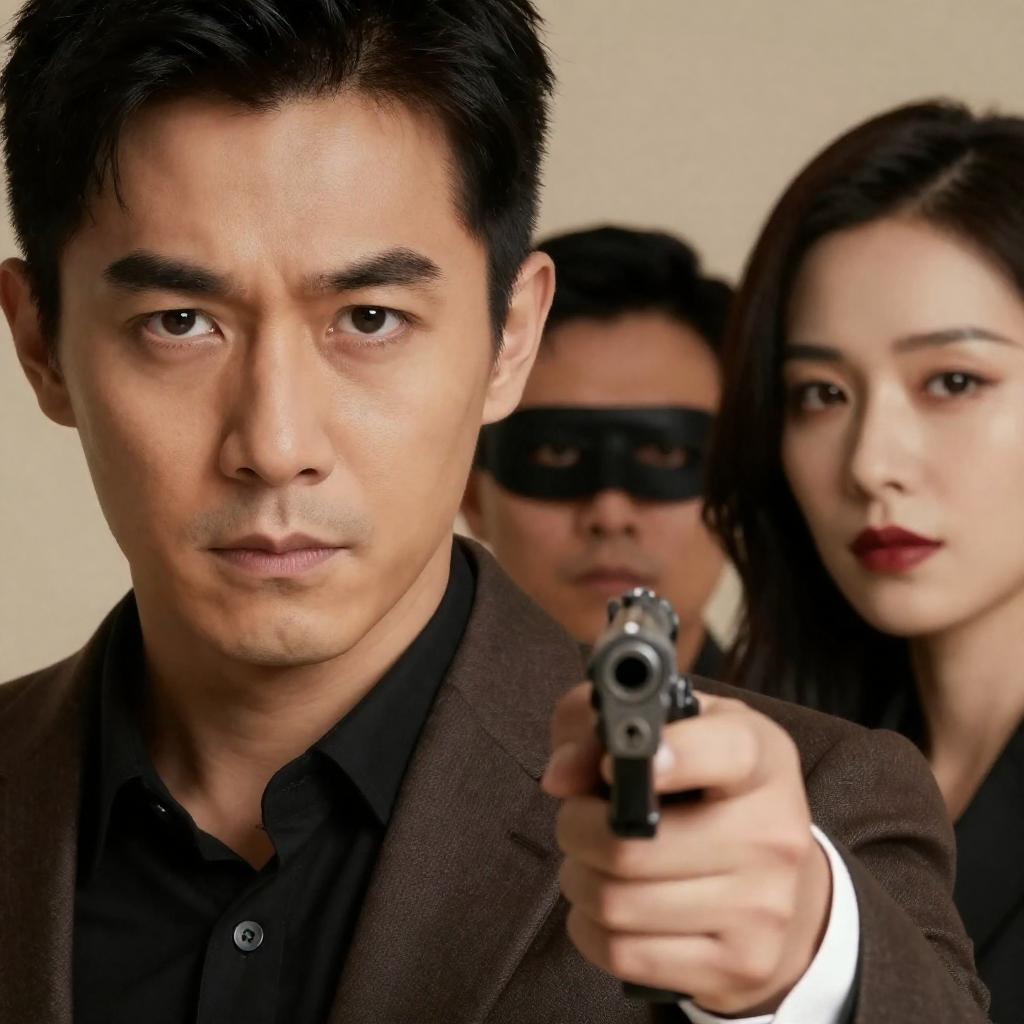A photograph featuring an Asian man in a white suit and black bow tie holding a card with an intense gaze, positioned in the foreground. Behind him stands an Asian woman with short hair wearing a red sleeveless dress, smiling. They are next to a roulette table with chips, set against a red background.