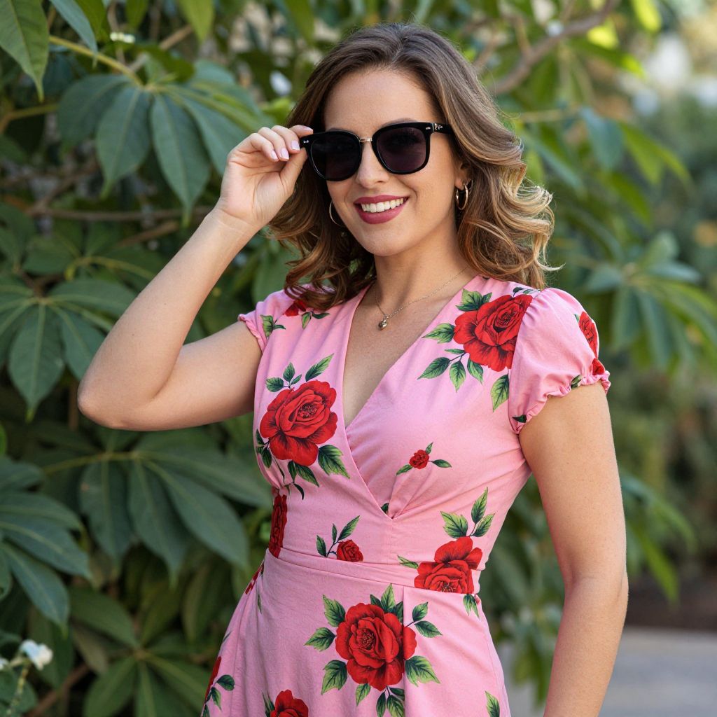 Photograph of a smiling woman with fair skin, brown wavy hair, and dark sunglasses. She wears a pink, short-sleeved, V-neck dress adorned with large red roses and green leaves. She is accessorized with a gold necklace and small earrings. Her right hand adjusts her sunglasses. The background features lush, dark green tropical leaves, creating a vibrant, natural setting. The lighting is bright, highlighting her cheerful expression and the vivid colors of her dress and accessories.