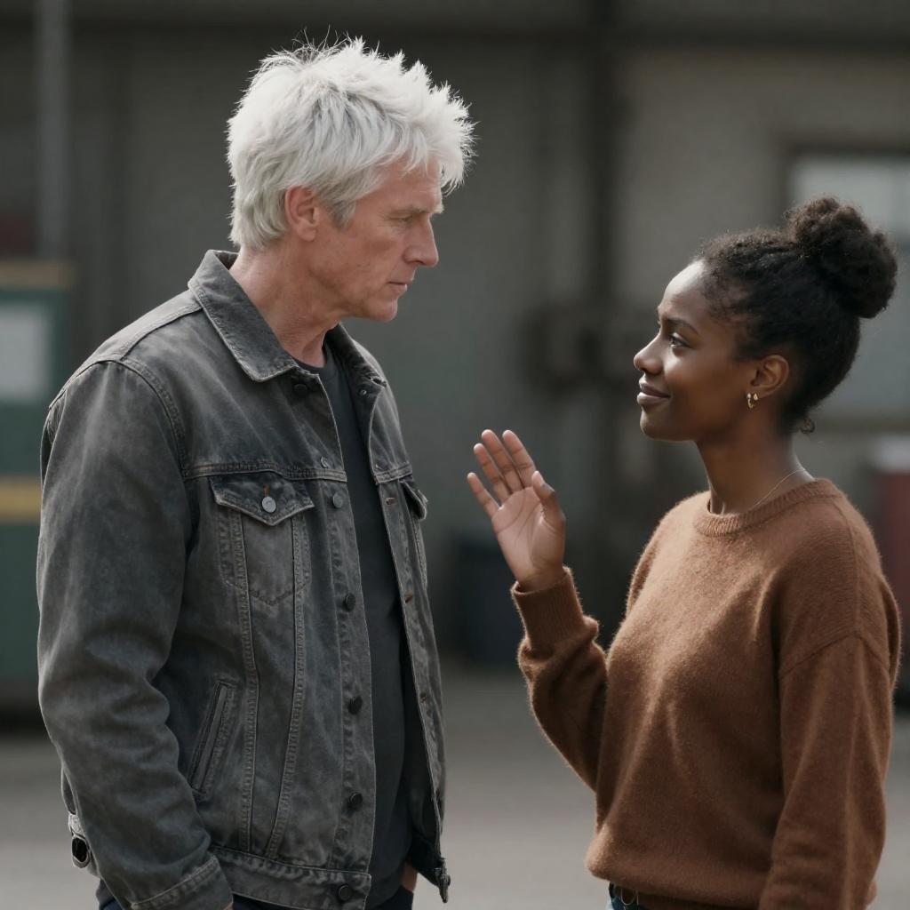 Photograph of three people standing back-to-back, holding guns. Blonde woman in grey sweater and blue pants on left, older white man with grey hair in center, black-haired woman in red jacket on right. Blue space background with glowing lines. Intense expressions.