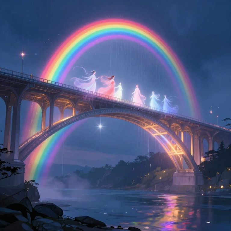 Serenity and wonder intertwine as ethereal figures beneath a luminous bridge weave haunting melodies that dissolve into the air, manifesting as vibrant rainbows that bridge the gap between the tangible and the ineffable.