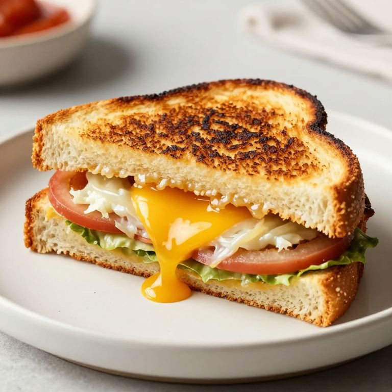 Photograph of a grilled cheese sandwich with melted cheddar, lettuce, tomato, and white cheese filling, placed on a white plate.