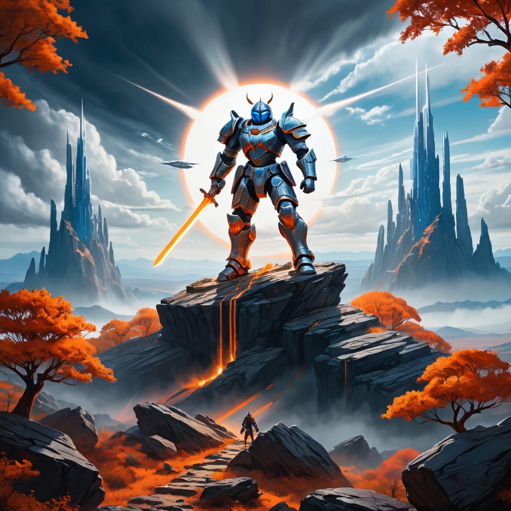 Three armored warriors with glowing swords stand on a rocky terrain with bright orange foliage under a vast sky with dynamic clouds. In the distance, a large futuristic floating tower emits a beam of light. The scene is illuminated with dramatic lighting, featuring a surreal mix of warm orange and cool blue colors, showcasing an epic fantasy battle preparation.