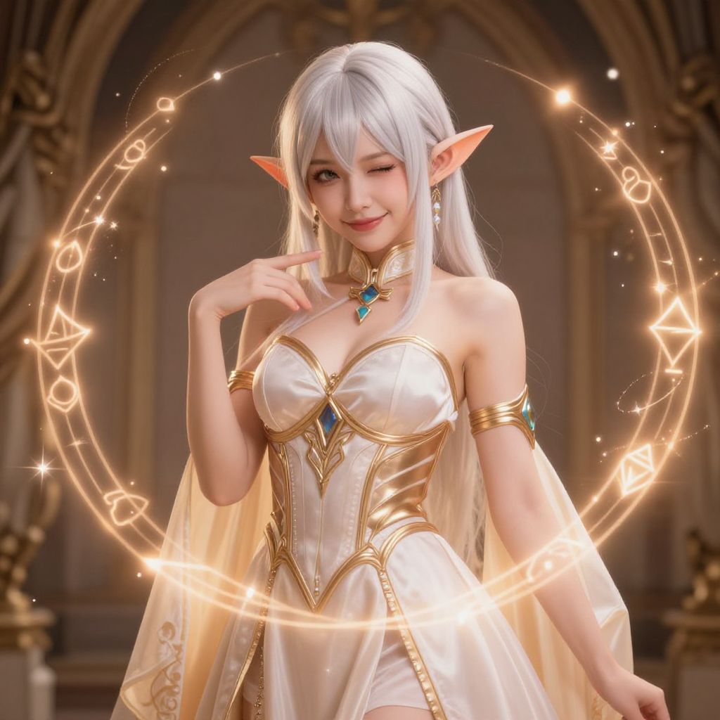 Digital art of a white-haired, elf-like woman with pointed ears, in a golden-trimmed white dress, winking, surrounded by glowing magical