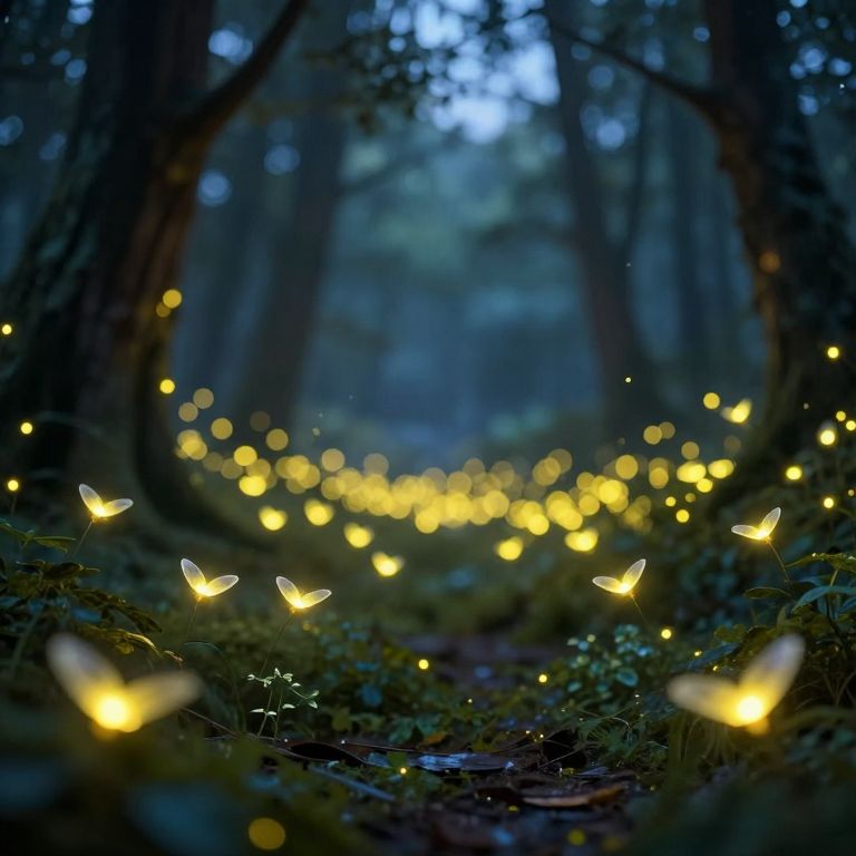 Photograph of a mystical forest at twilight, illuminated by numerous glowing, yellow fireflies with delicate butterfly-like wings, creating a magical pathway through the dark
