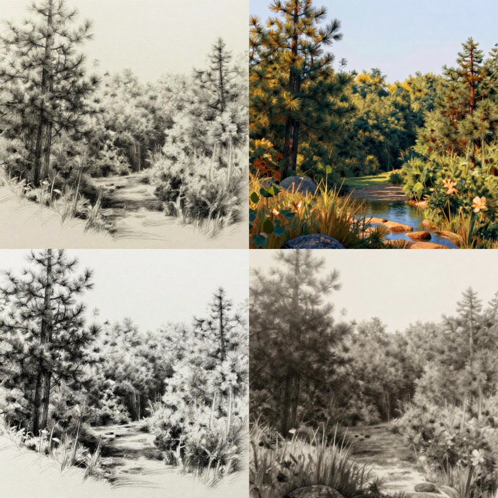 Drawing to image conversion, detailed charcoal sketches turning into lifelike photos of nature scenes, seamless transition from monochrome to full color, soft lighting highlighting the artistic evolution, mix of traditional and digital art styles