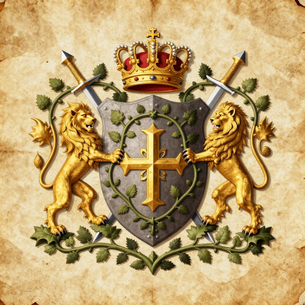 Family emblem maker designing a majestic heraldic shield with intricate vines, golden lions, crossed swords, and a royal crown atop, set against an ancient parchment background, evoking medieval artistry and noble lineage.