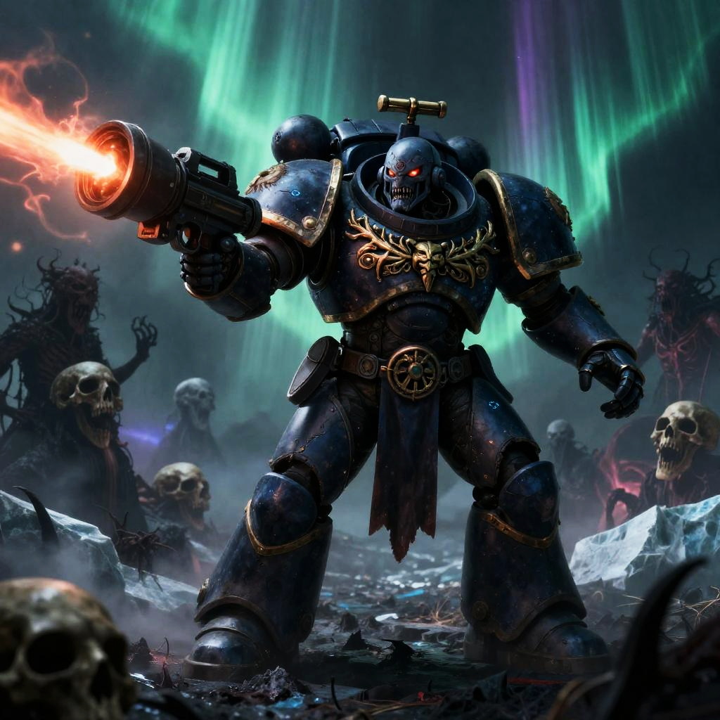 Terrifying image of a Chaos Space Marine, clad in cracked obsidian ceramite veined with pulsating daemon-spores and tarnished brass sigils, wielding a twin-barreled hellmaw bolter that vomits living shadow and trapped, wailing souls, amidst a necrotic glacier of blackened bone beneath writhing auroras of screaming light.