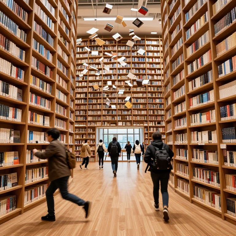 Photograph of a grand library with tall wooden bookshelves filled with books on both sides. The floor is made of polished wood, reflecting the overhead lights. Several people, dressed in casual winter clothing, are walking down the aisle. A large window at the far end allows natural light to stream in. Colorful book spines add vibrancy, and floating, geometrically-shaped bookends hang from the ceiling, creating a modern contrast. The scene is bustling yet orderly, with an inviting, warm atmosphere.