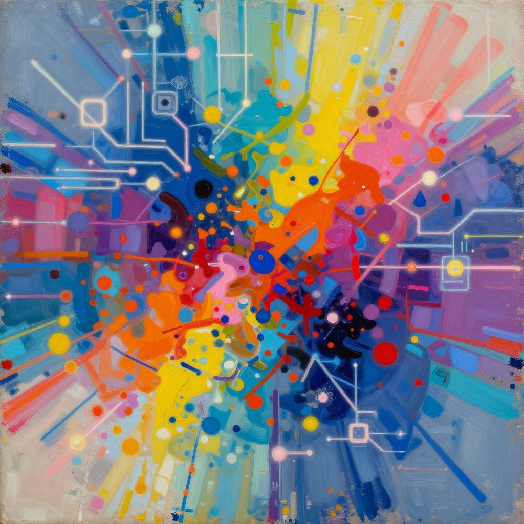 AI image to art transformation showcasing a futuristic digital painting style, vibrant colors merging with abstract shapes, blending technology and creativity in a surreal art piece, high detail, dynamic composition, vivid lighting