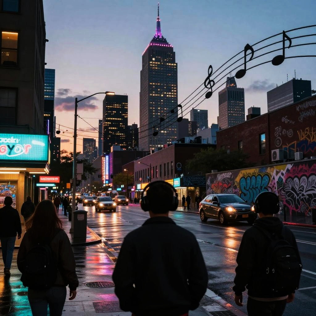 Create an urban album cover with a gritty metropolis backdrop, towering skyscrapers under a stormy sky, a lone musician standing on rooftop with a guitar, street art murals, smoky ambiance, muted color palette with pops of bright graffiti colors, cinematic perspective.