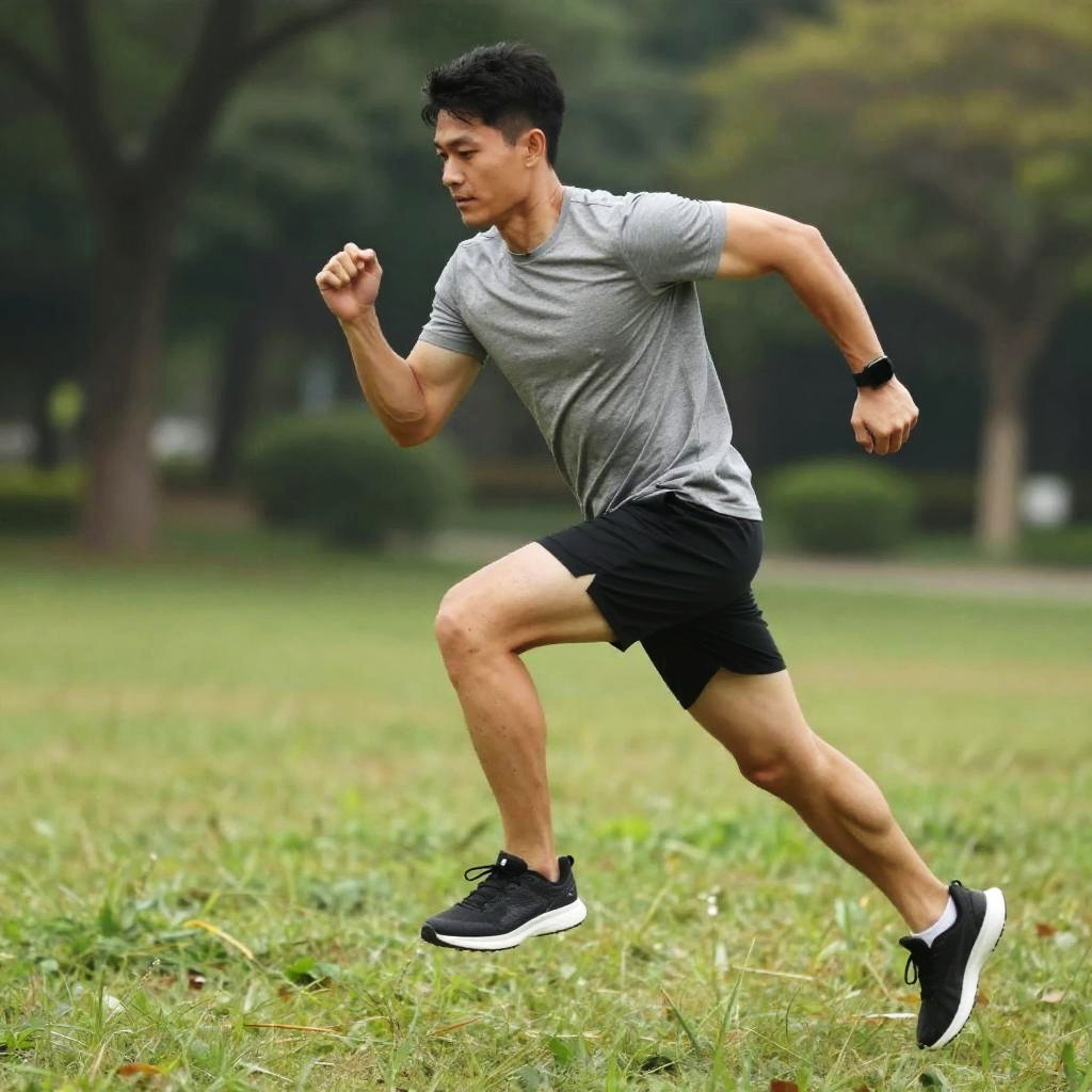 Photograph of an Asian man jogging in a grassy park, wearing a gray t-shirt, black shorts, black sneakers, and a black wristwatch
