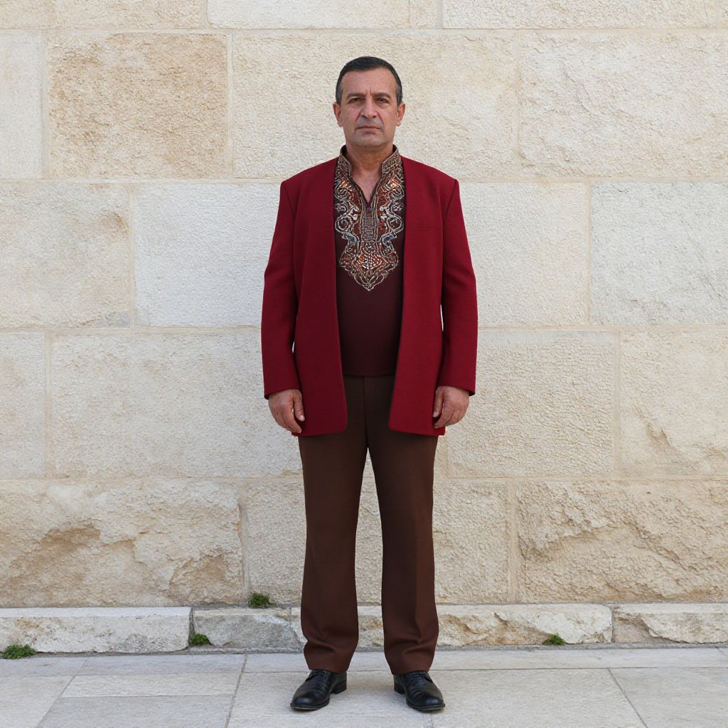 Turkish National Costume Male, man in a red and brown outfit standing in front of a stone wall