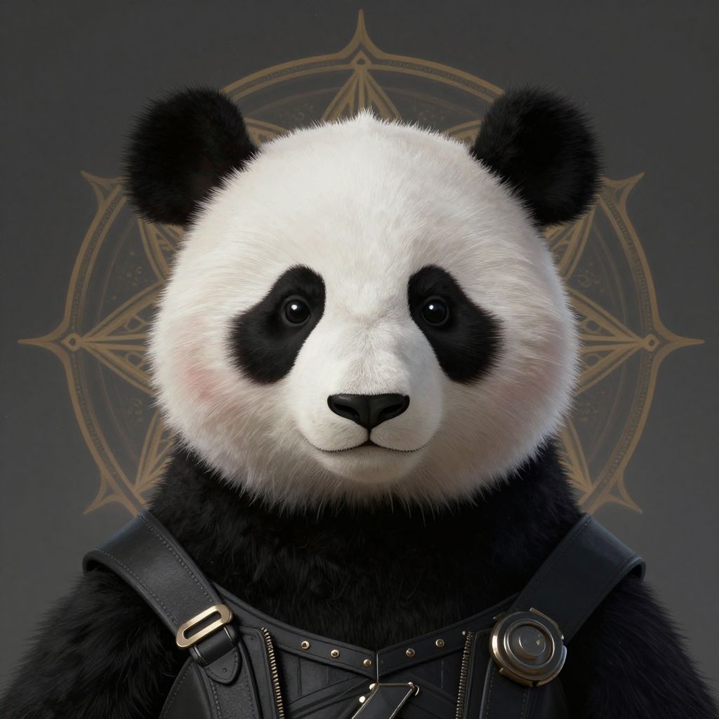 Photorealistic digital illustration of a panda bear with a human-like upper body, wearing a dark, leather, medieval-style vest with metal buckles and straps. The panda's fur is white with black patches around the eyes and ears, and it has a calm, neutral expression. The background is a gradient of dark blue to black with a gold, intricate, circular mandala pattern behind the panda's head. The overall style combines realistic animal features with fantasy elements, creating a unique and imaginative character.