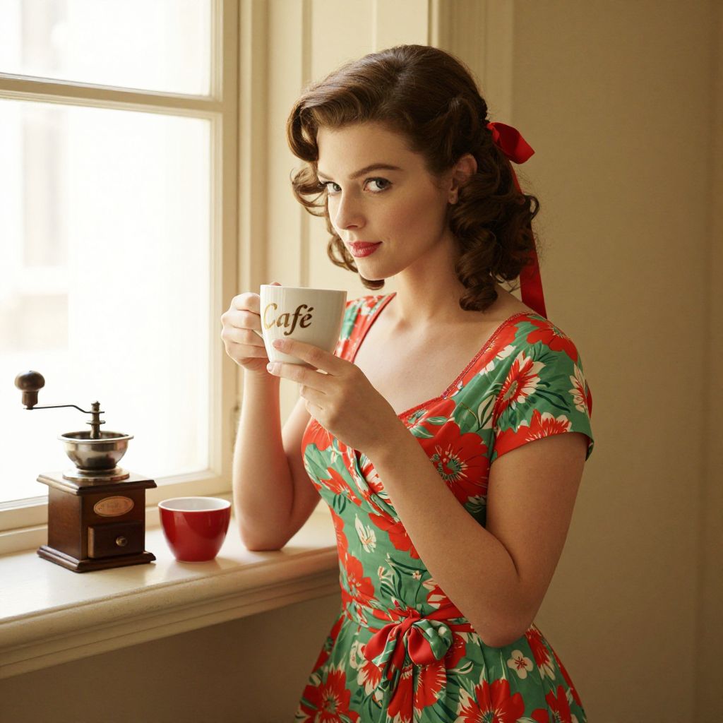 In this image, a woman exudes vintage charm, reminiscent of the style of Gil Elvgren. She is adorned in a vibrant red and green dress with a floral pattern, her hair styled in elegant curls, and a red ribbon tied in a bow at the back. She holds a coffee cup with the word \"Café\" elegantly inscribed, suggesting a morning ritual. To her left, a coffee grinder and a small red cup rest on a windowsill, adding to the cozy, nostalgic atmosphere. The background features a soft, warm hue, with a window that allows natural light to filter in, enhancing the scene's inviting ambiance. The overall composition is balanced, with the woman centrally positioned, creating a harmonious visual narrative.