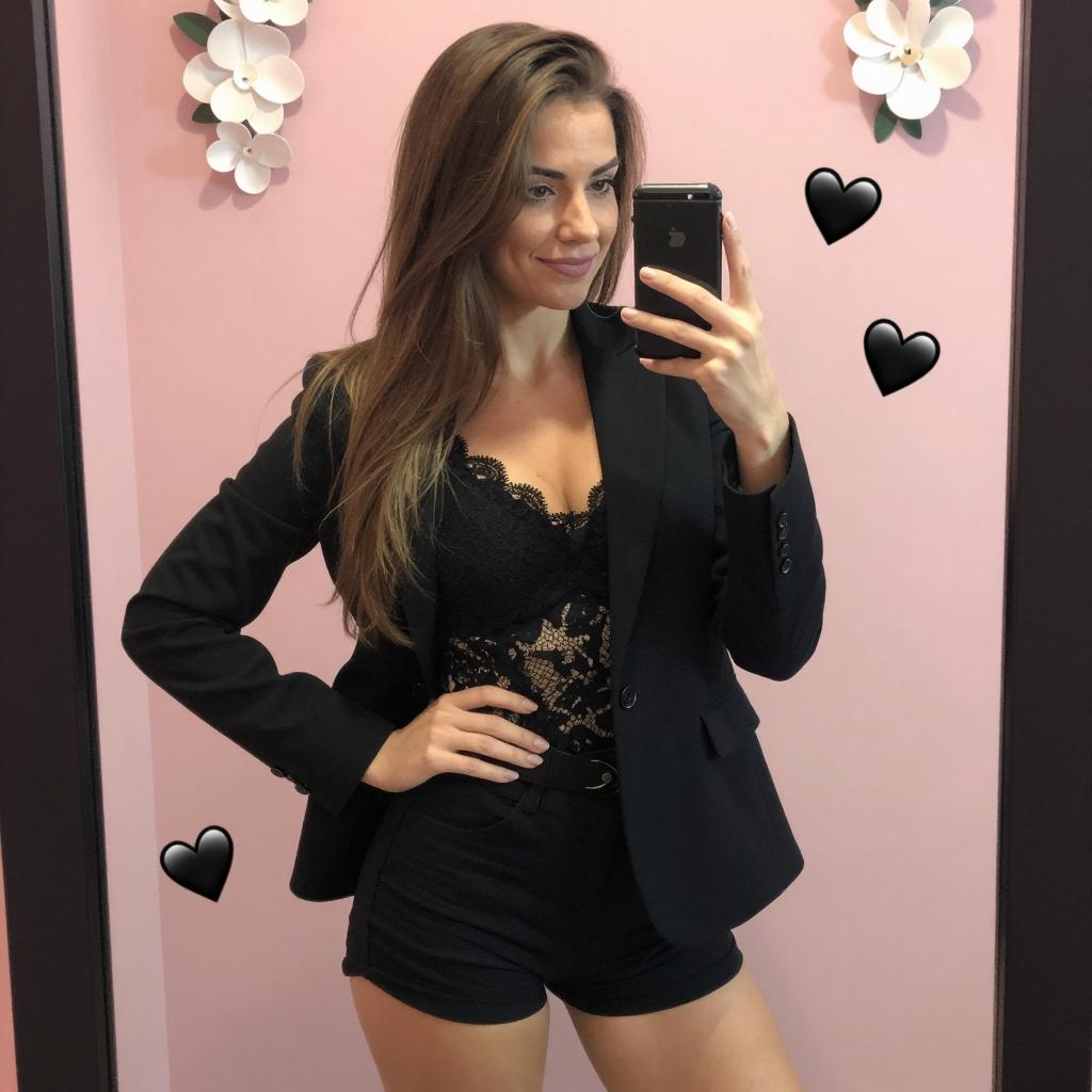 Woman with long brown hair, black blazer, black lace top, black shorts, standing in front of mirror, taking selfie with black phone. Pink wall, white floral decorations, black heart sticker. Confident pose, slight smile, right hand on hip.