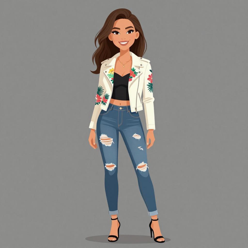 Woman with pretty face and pretty hair. smiling Woman, casual chic, oversized pale pink knit cardigan with two front pockets, partially tucked into high-waisted light blue denim jeans, subtly distressed, full sleeves pushed up to the elbows, visible white camisole underneath, clear strap open-toe heels, long dark wavy hair, studio background. --sref 1467