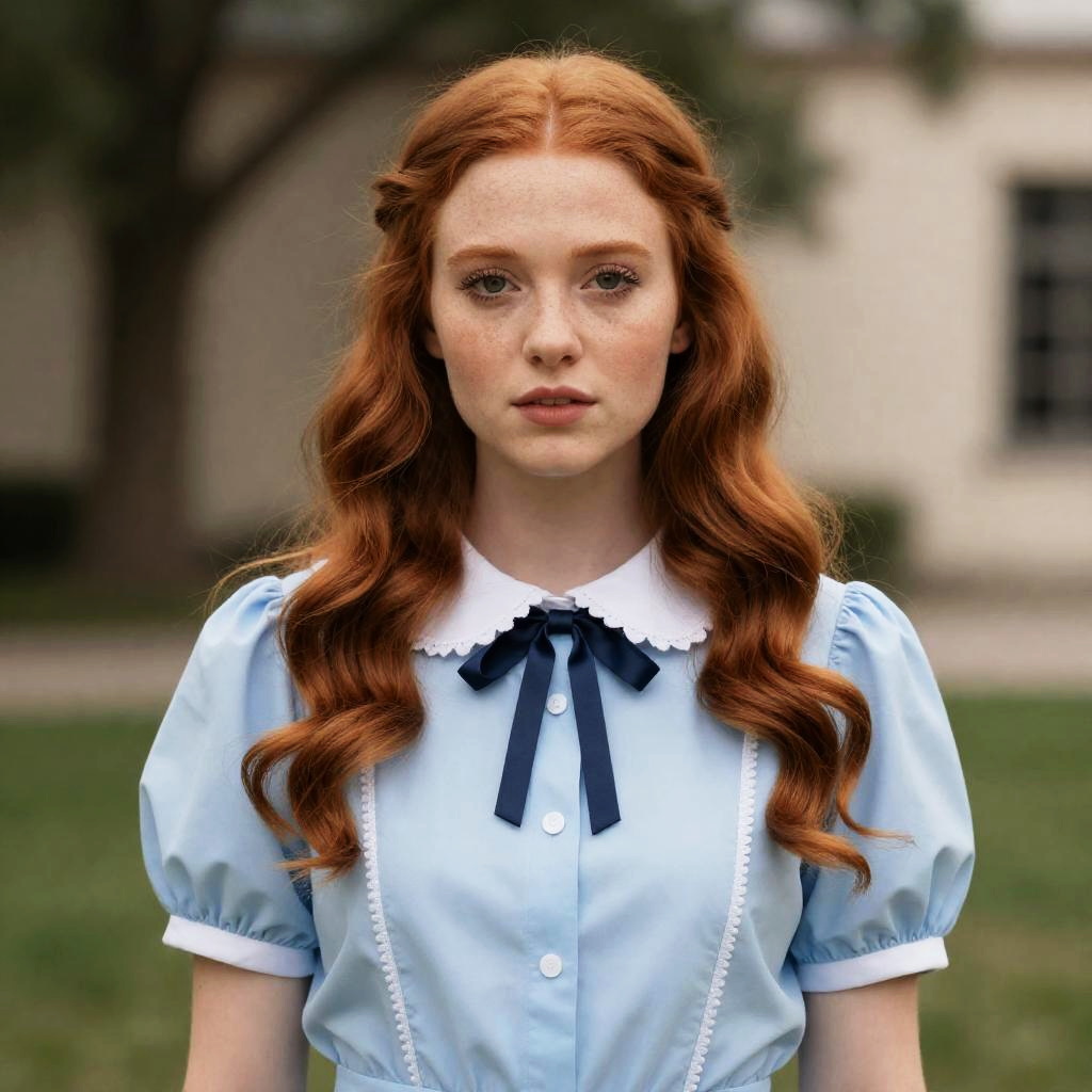 Dorothy Costume Woman, woman with red hair and blue dress looking at camera