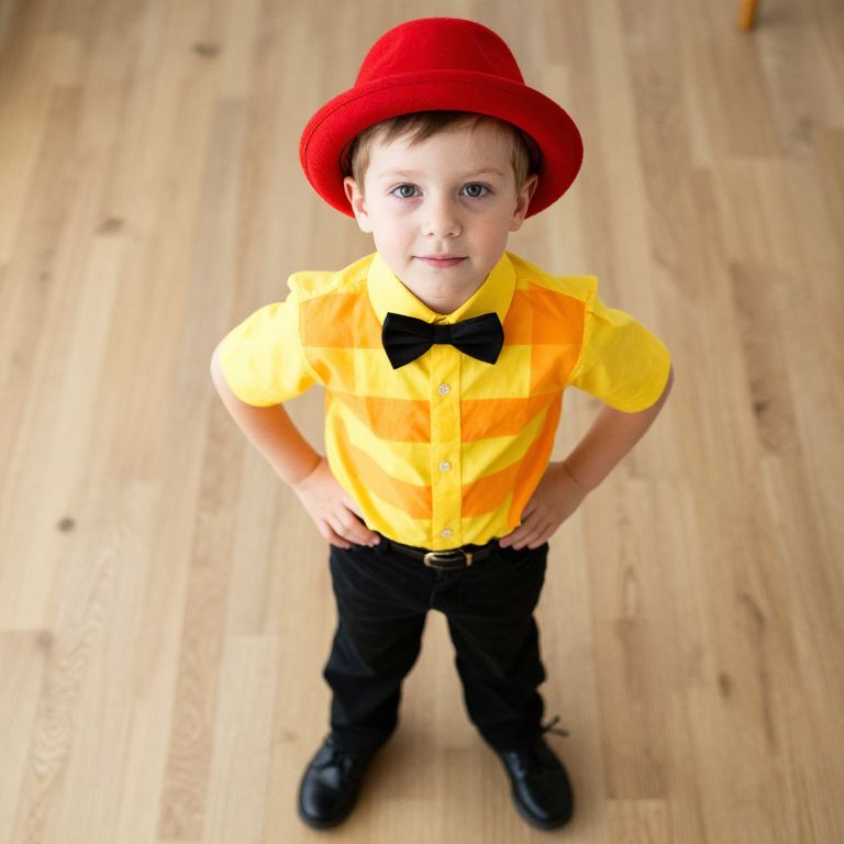 Photograph of a young boy standing on a wooden floor, viewed from above. He has fair skin, blue eyes, and short brown hair. He wears a bright red velvet hat, a yellow short-sleeved shirt with black bow tie, and black pants with black shoes. His hands rest on his hips, and he looks directly at the camera with a slight smile. The background is a simple wooden floor with no other objects visible. The image has a bright, cheerful color palette and a slight fisheye lens effect.
