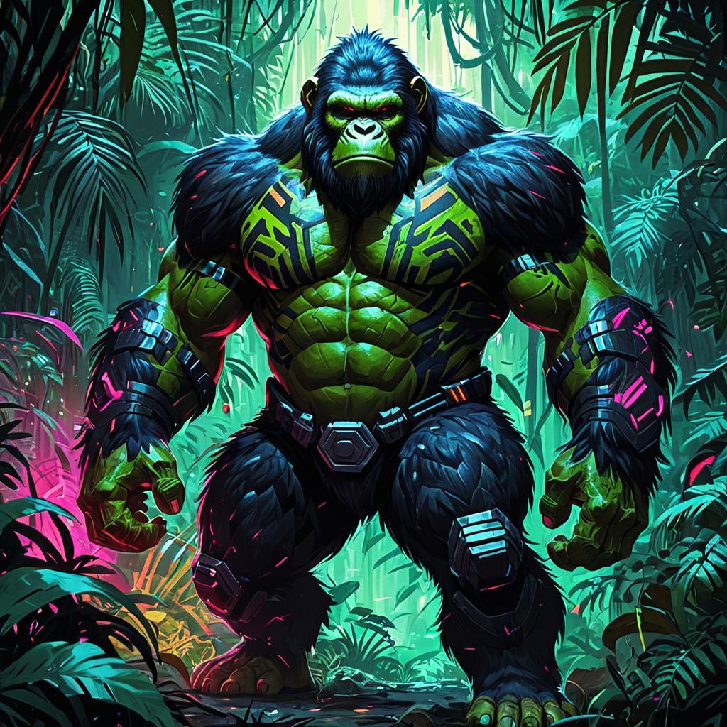 Digital painting of a hulking, muscular ape with tribal cybernetic enhancements standing in a dense neon-lit jungle. The ape features exaggerated buff physique with furry textures and wears stealth camouflage armor with glowing neon accents. The artwork combines elements of fantasy and sci-fi in a vibrant jungle setting.
