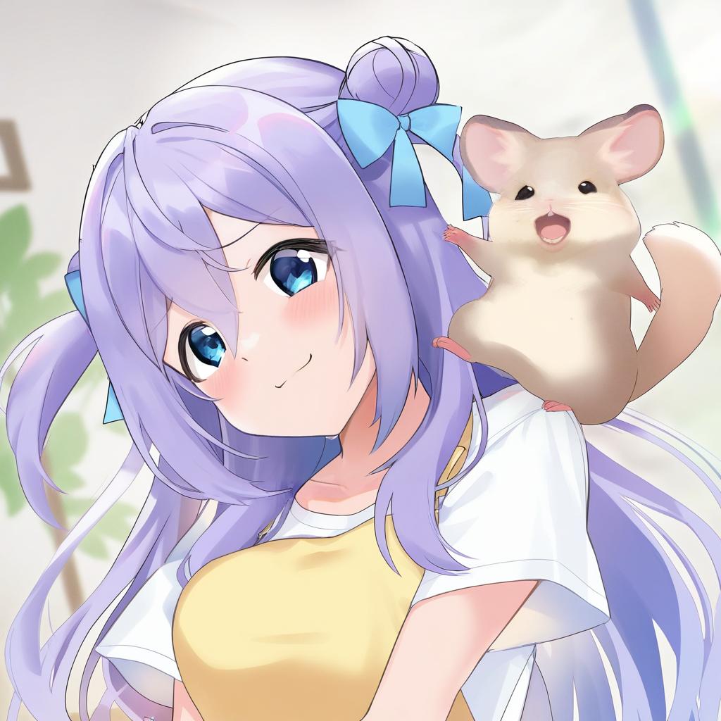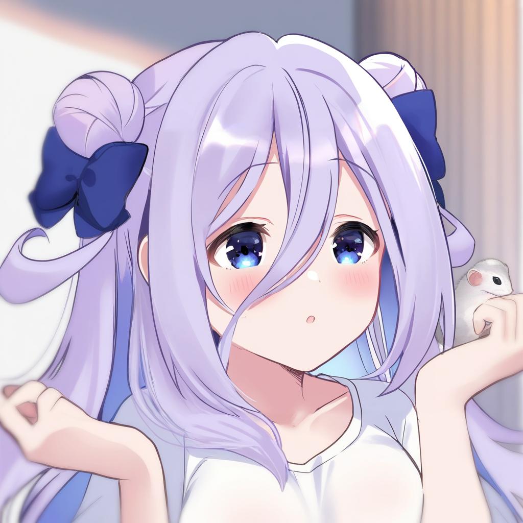 Amamiya shizuku (hizuki yayoi), original, 1girl, hair between eyes, blue eyes, purple eyes, purple hair, very long hair, blue hair, two side up, double bun, hair bow, medium breasts, collarbone, white shirt, blue bow, chinchilla (animal), animal, by artist vanilla (miotanntann), leet