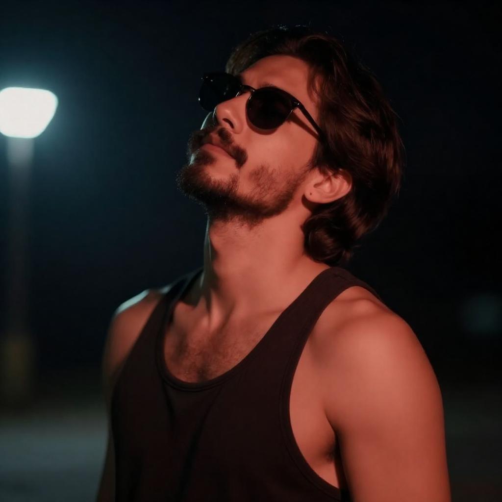 Photograph of a man with medium-length dark hair and a beard, wearing sunglasses and a black tank top, illuminated by a dramatic red and orange light. His head is tilted back, eyes closed, against a blurred, dark background with glowing lights. The image has a high-contrast, moody atmosphere.