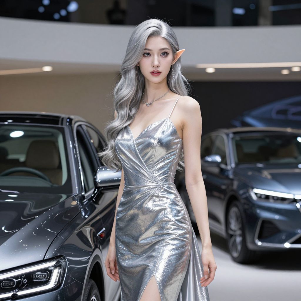 A graceful silver siren with delicate features and luminous eyes, standing confidently in a luxury automotive showroom, her metallic shine reflecting off polished cars, wearing a sleek, elegant metallic dress that moves with a whisper, creating a fantasy-meets-future aesthetic under soft studio lighting.
