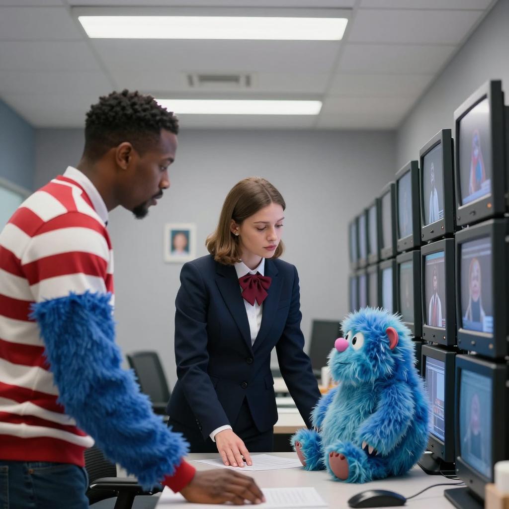 A photograph of a classroom. African-American man in beige coat and red polka dot tie stands front left, looking serious. Blonde woman in gray coat stands beside him. Students with computers in foreground. Chalkboard in background reads "ONLINE LINGUISTICS." Computer monitor on desk labeled "14." Wooden walls, framed pictures. Person in black security uniform stands in background.