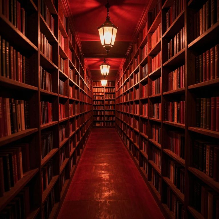 A crimson-lit library corridor stretches endlessly, its shelves lined with books that seem to pulse faintly, as if alive, under the eerie glow of suspended lanterns that cast shadows like whispers of forgotten secrets.