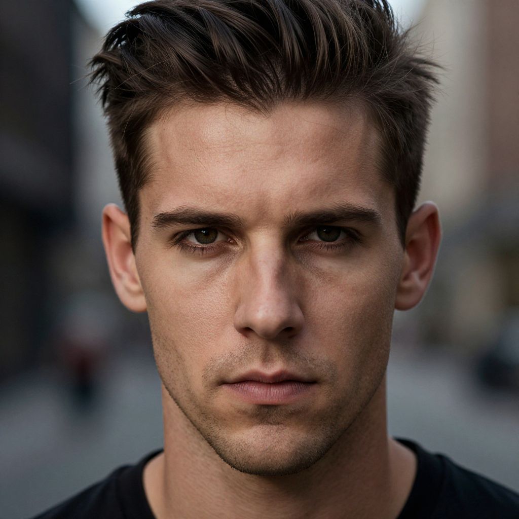 Two-Tone Hair, fit european man, professional portrait, studio setting, soft background blur, sharp facial features, confident expression, realistic skin texture, high-resolution, natural hair coloring