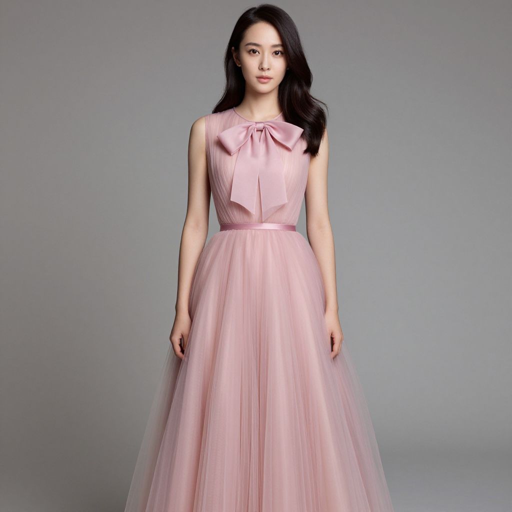 Elegant woman wearing a sleeveless pink tulle dress featuring a large bow at the neckline and a puffy skirt, exuding sophistication against a neutral background.