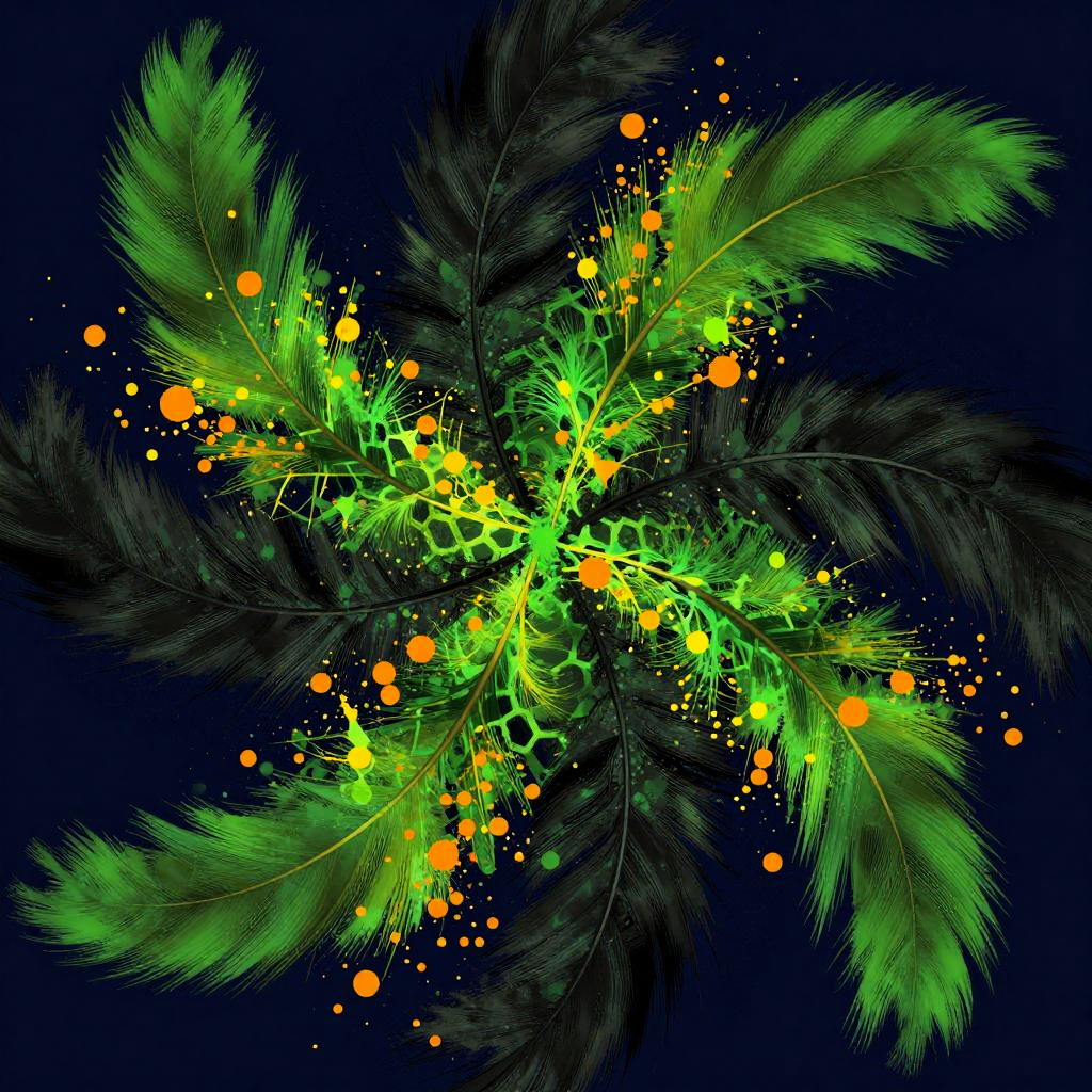This is a vibrant, abstract digital artwork with a dark blue background. It features swirling green and black feather-like patterns, dotted with bright orange and yellow splashes. The green shapes create a geometric, honeycomb-like texture in the center, while the orange dots are scattered throughout. The overall style is dynamic and chaotic, with a mix of organic and geometric elements.