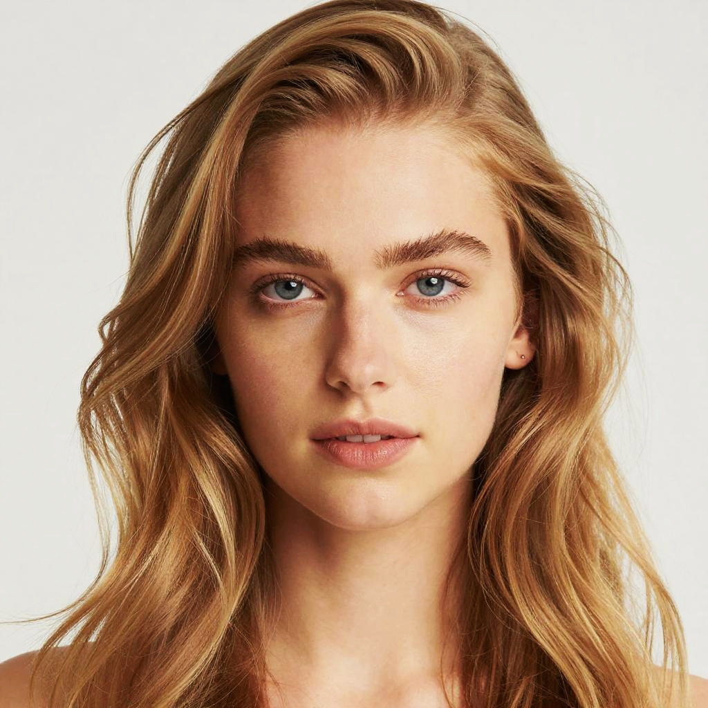 Eastern European hair, soft blond with natural volume, close-up on face, fresh and natural beauty, minimal makeup, studio lighting