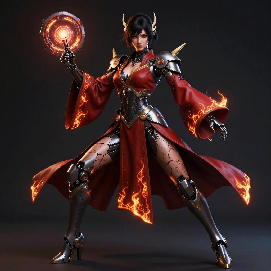 Masterpiece, best quality, (photorealistic:1.4), (ultra detailed:1.3), mecha Female Techno-Warrior: A futuristic warrior with cybernetic legs for enhanced agility, a neural interface for advanced combat tactics, and a built-in energy shield, Midnight Nebula Bodysuit, Ruby Red Mage Robe with Fiery Ember Trims: The trims of the robe emit a gentle fiery glow, evoking the power of flames, cracked skin