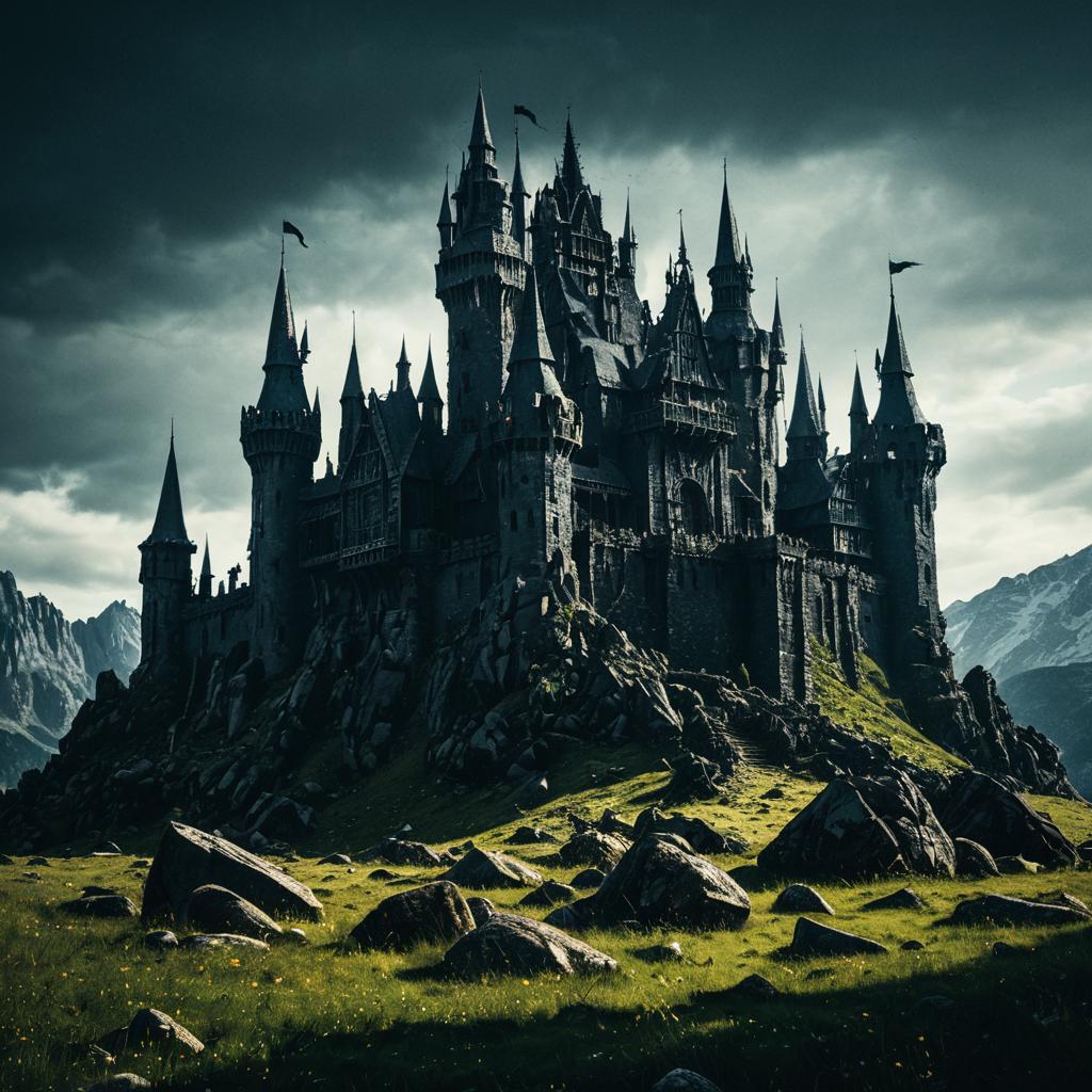 A very intricate and ominous ancient fortress stands in the middle of a misty valley covered with eerie mist. Inspired by the cinematic style of dark fantasy. The structure features towering spires, casting shadows across the surrounding landscape. A scene filled with foreboding.