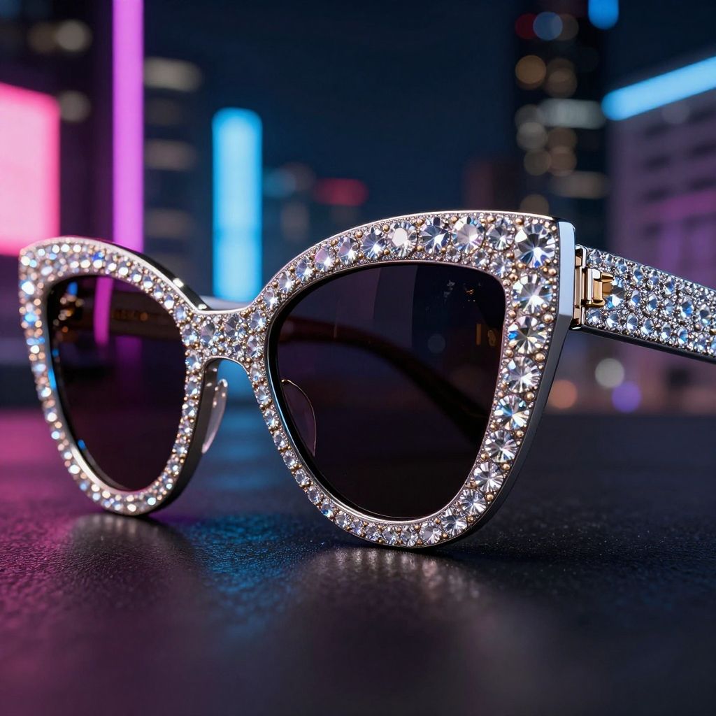 Cher sunglasses close-up, shimmering crystal-studded oversized frames, dramatic cat-eye shape, reflecting neon city lights at night, high fashion editorial style, glamorous and bold
