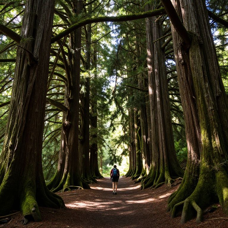 A lone hiker traverses a sunlit forest path flanked by towering ancient trees with sprawling roots and moss-covered trunks, their intricate branches forming a natural archway overhead.