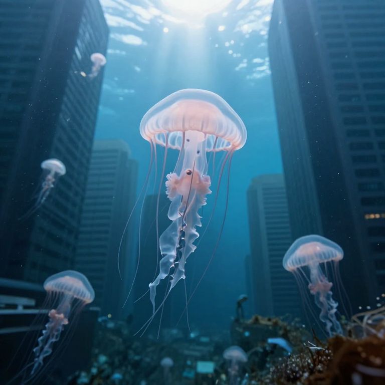 Jellyfish-like entities drift serenely through a sunken metropolis, their translucent forms suspended between towering skyscrapers now cloaked in aquatic mystery.