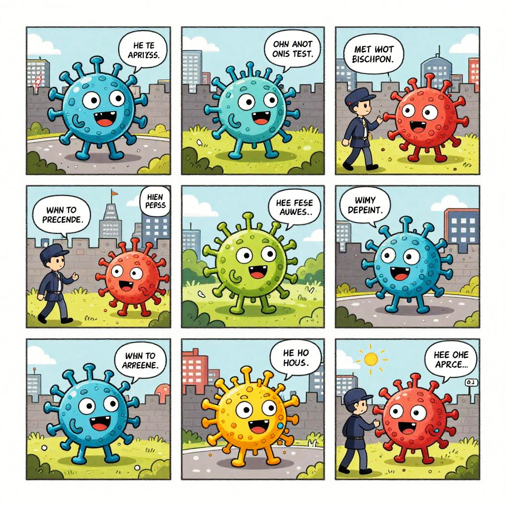 A creative infectious disease cartoon illustrating a microscopic city where virus characters plot their invasion, surrounded by soldier-like immune cells defending the city walls, drawn in a comic strip style with dynamic frames and bright, engaging colors.
