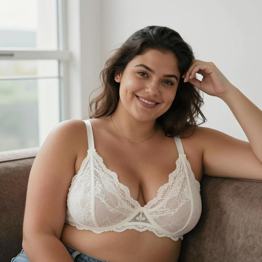 Photograph of a curvy woman with tan skin and long black hair, lying on a wooden table in a sunlit room. She's wearing a white lace bra and panties, with large breasts prominently visible. She's holding a bunch of green grapes to her mouth, eyes closed in pleasure. The camera angle is low, close to her chest, with a shallow depth of field, blurring the background of wooden furniture and a painting. Warm, natural light highlights her figure.