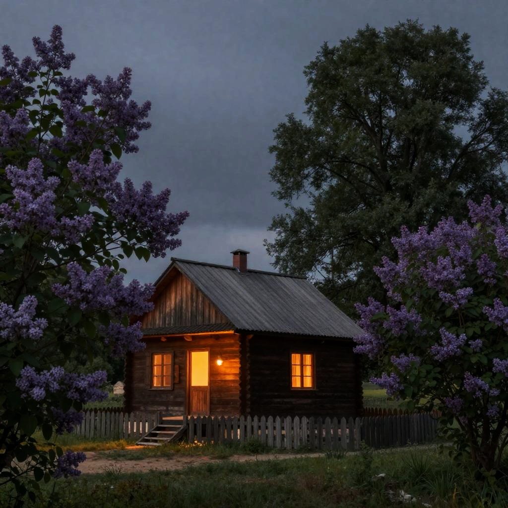 Nature, epic building in the center, warm, glow at night, raw, hdr, (summer camp, lilac colors, provence, wooden houses, simple design of rustic buildings, russian village:1.3), cinematic, slate grey, dramatic light, architecture