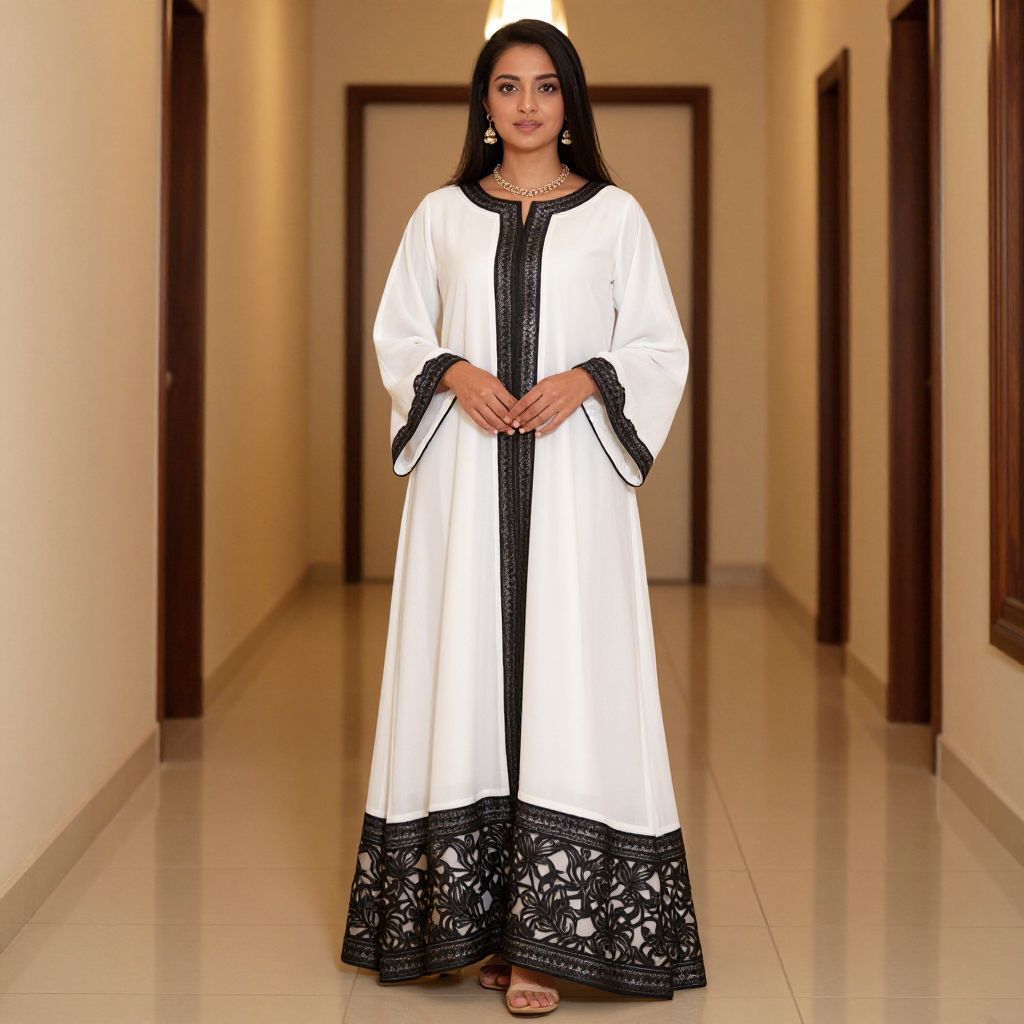 Open Abaya Costume, woman in a white and black dress standing in a hallway