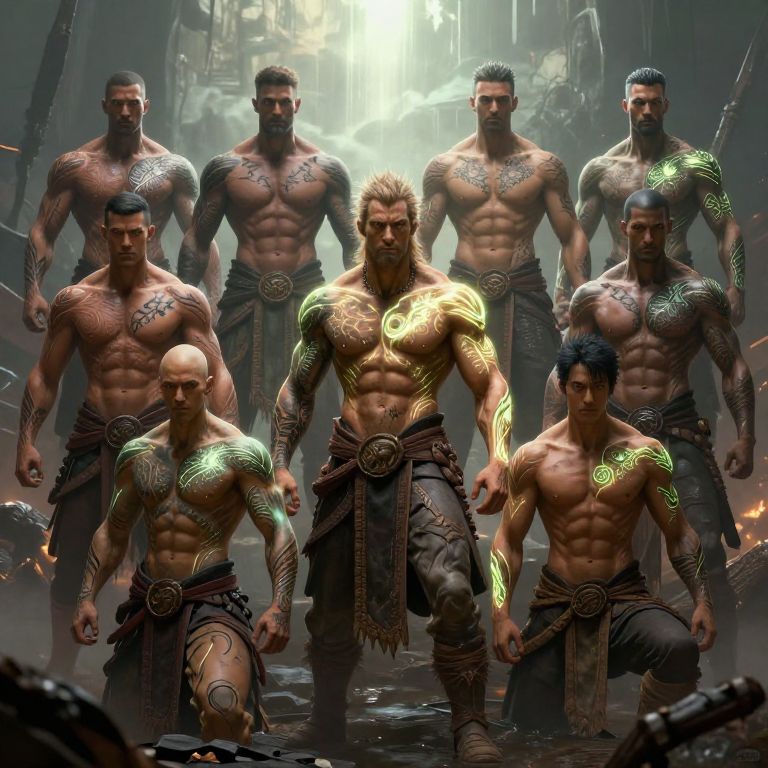 This digital CGI image features a group of nine muscular, shirtless men with diverse tattoo styles, standing in a dimly lit, industrial, war-torn setting. The central figure, with blonde hair and glowing green tattoos, stands out, flanked by eight other men with various tattoo designs, including tribal and glowing patterns. They wear dark, tattered loincloths with belts. The background is filled with dark, metallic structures and debris, illuminated by a bright, glowing light at the top center, creating a dramatic, intense atmosphere. The men have serious, determined expressions, exuding strength and readiness.