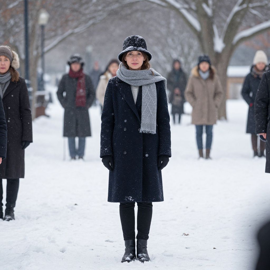 Photograph of a young Asian woman standing in a snowy urban park. She wears a black coat, gray scarf, black hat with white spots, and black boots. Her hands are in her coat pockets. She stands in the center, facing the camera, with a serious expression. In the background, several people in winter clothes, including coats and hats, walk along a snow-covered path. Bare trees and a lamppost are visible, with snowflakes gently falling. The scene is bright with white snow contrasting against darker winter clothing.
