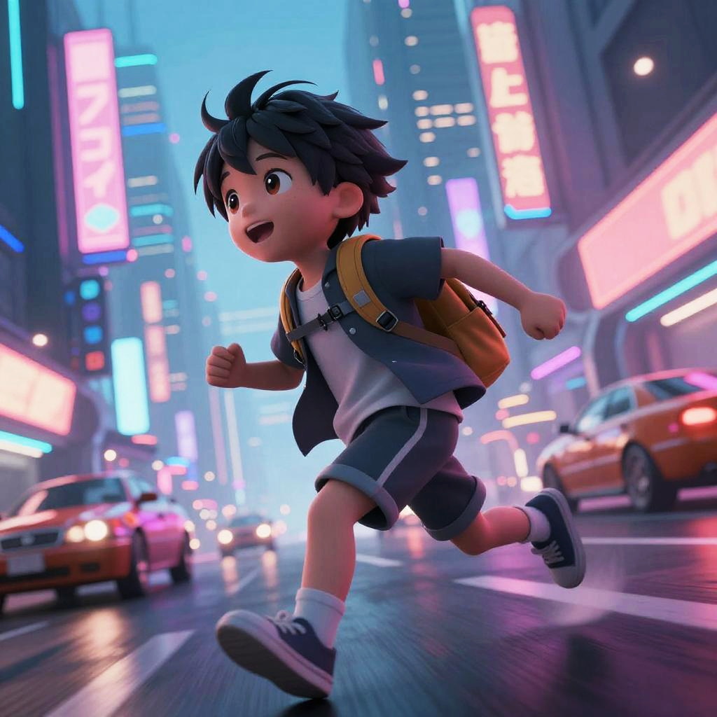 Anime kid black hair running through a futuristic neon-lit city with glowing signs and flying cars, wearing casual clothes with a backpack, intense motion blur and dynamic lighting effects, cyberpunk anime style with vibrant color palette