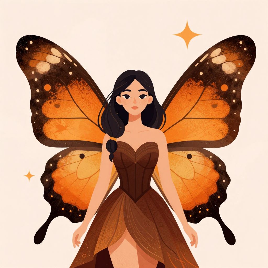 Digital illustration of a fair-skinned woman with long black hair, wearing a brown strapless dress, and large, orange and black butterfly wings, against