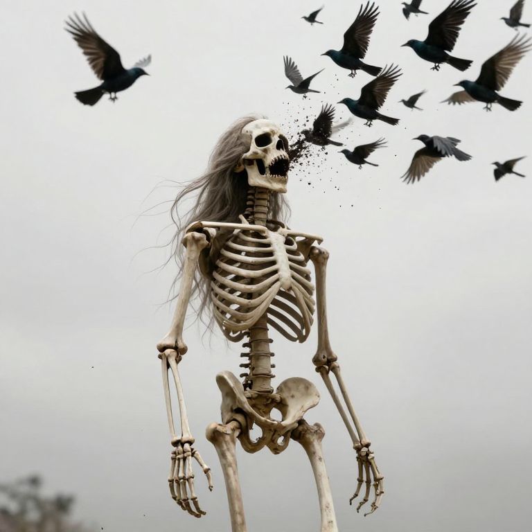 A skeletal figure with long hair and muscular form stands solemnly, as a swarm of birds erupts from its open mouth, defying gravity and reality in a haunting, surreal tableau.