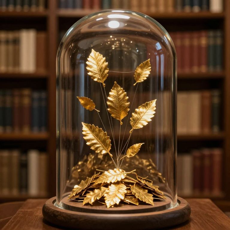 Sealed within a transparent glass dome atop a wooden pedestal, a collection of golden, leaf-shaped artifacts floats gracefully, suspended by delicate threads, while a pile of similar items rests below, all encased in a library setting with rows of books lining the shelves behind.