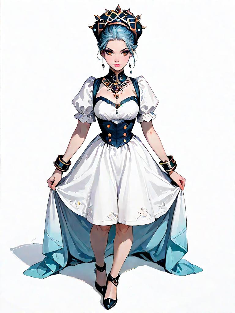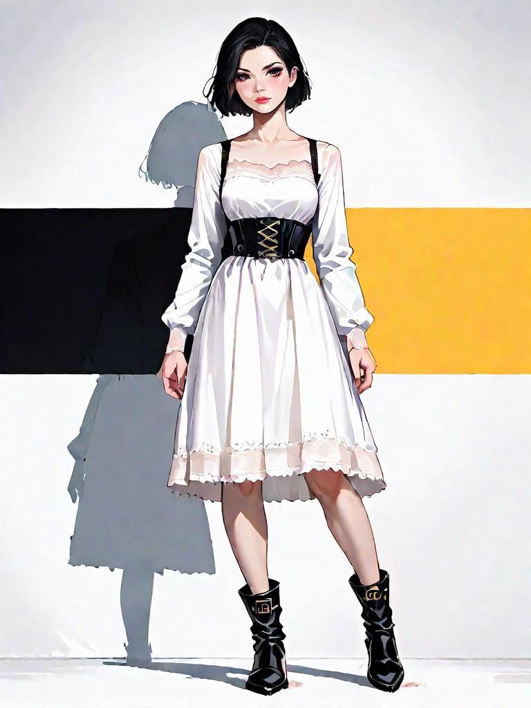1girl, source_comics, realistic face, full body shot, Woman, contemporary chic, white lace top with a deep-V neckline and long sleeves, matching form-fitting high-waisted skirt, minimal silver hoop earrings, holding a metallic spherical clutch, plain white backdrop.