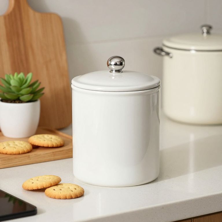 White ceramic tea canister with a silver knob lid sits prominently on a kitchen countertop, surrounded by a wooden cutting board, three golden biscuits, a small potted succulent, and another cream-colored container, creating a cozy and organized kitchen scene.