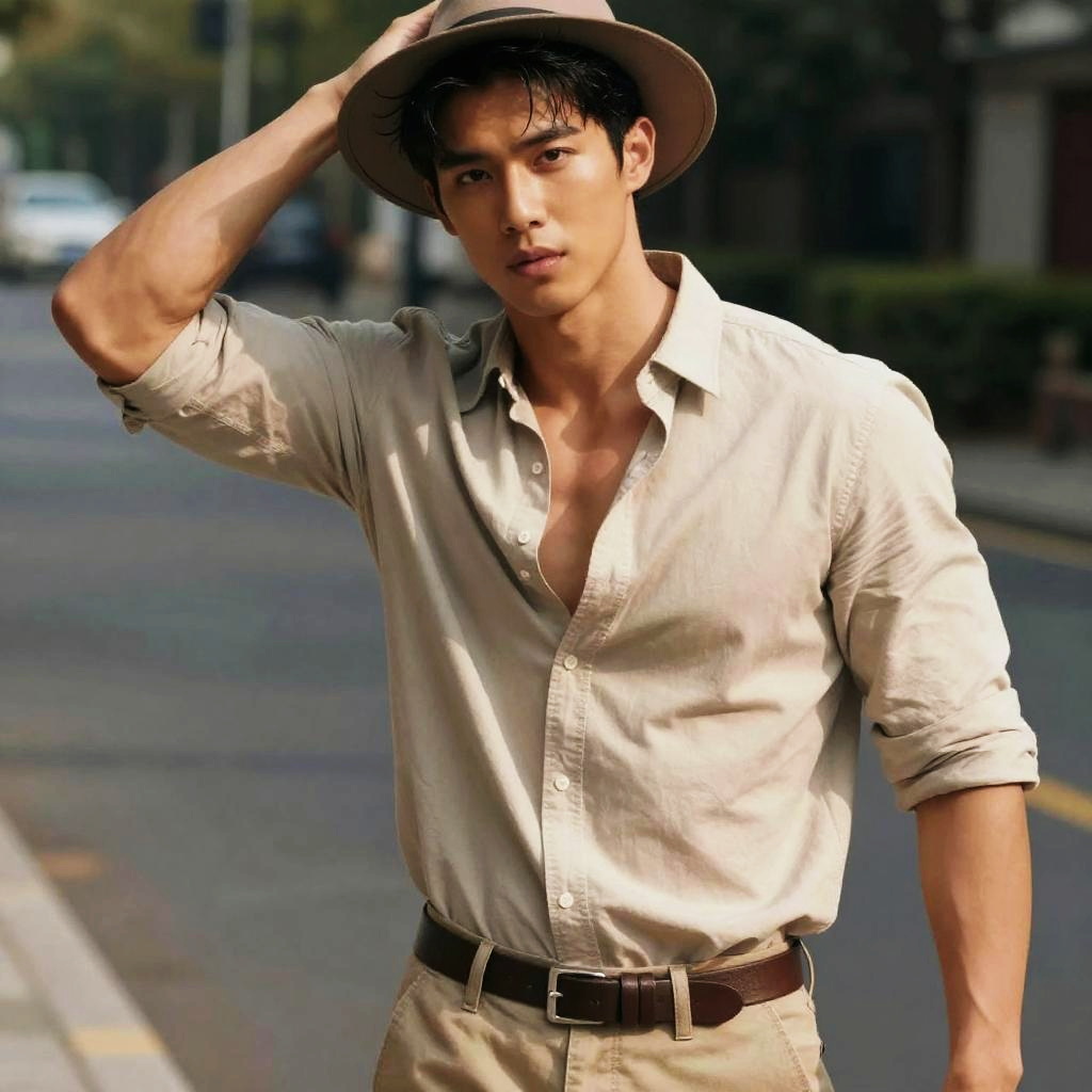 Photograph of an Asian man with a lean, toned physique, standing on a sunny urban street. He has short, dark, slightly wet hair, and is wearing a light beige, button-up shirt with the top buttons undone, revealing a hint of his chest. His beige pants are secured with a brown belt. He is also wearing a wide-brimmed, brown hat, which he is adjusting with his right hand. The background shows a blurred cityscape with trees, buildings, and a few parked cars. The lighting highlights his defined jawline and slightly tanned skin. The overall style is casual and slightly adventurous.